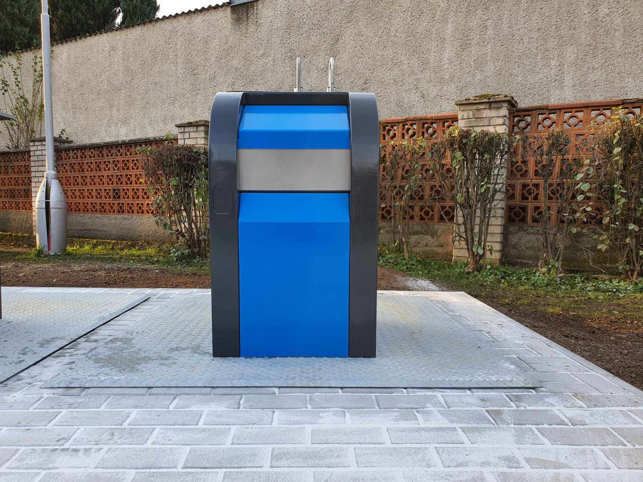 Kiosk wrzutowy - widoczna naziemna część kontenera. Obróbka powierzchni polegająca na malowaniu proszkowym oraz zabezpieczaniu tej powierzchni lakierem antygraffiti dla łatwiejszego usuwania sprayów i naklejek. Pojedyńsczy kiosk wrzutowy zaprojektowany w rozmiarach S, M, L. Podwójny kiosk wrzutowy do selektywnej zbiórki kilku różnych typów odpadów mają rozmiary S i M. Większe kolumny pozwalają na zastosowanie większych otworów wrzutowych dla większych odpadów. W górnej części wrzutni zamocowany jest system podnoszenia typu 1/2/3 haki lub Kinshofer.